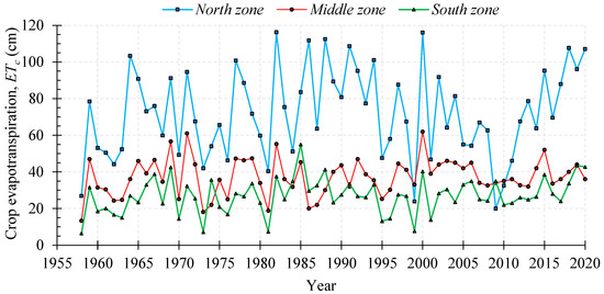 Crop water requirements are the major component of the water balance in the ND. Thus, updating the crop requirements is essential and important when considering all agroclimatic zones, climatic-dependent ETc, and crop coefficients [65]. Figure 3 shows the yearly averaged values of the actual ETc (in cm) for the three zones of the ND, according to the finding of “The National Commission on Water Requirements” using the Penman–Monteith equation based on the monthly meteorological data. Actual ETc was calculated based on the crop water requirements for maize and wheat, which were selected as two major crops for this study area. This is because wheat is the most important food security crop and is the major winter cereal grain crop, while maize is the second most important grain crop according to the Food and Agricultural Organization [66]. Additionally, Egypt is currently cultivating the largest area of wheat in its history at 3.6 million acres, which is equivalent to a third of Egypt’s agricultural area. Maize is grown and harvested principally in summer from May to October, while wheat is grown in the winter season. ETc increased from 1958 to 1964 and decreased from 1964 to 1981. Additionally, it increased in the year 1982 and returned to decreasing from 1982 to 1999, while it increased in the year 2000. From 2000 to 2007, it decreased, returning to an increase from 2007 to 2020. This cycling behavior of the ETc can be observed over the years studied (Figure 3), which is attributed to the variation of these climate variables and climate change.