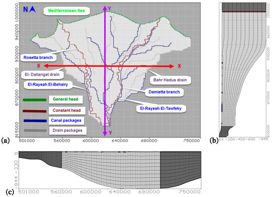 where Kx, Ky, and Kz are the hydraulic conductivities along the x, y, and z directions (LT−1), respectively, h is the piezometric head (L), qs is the volumetric flux per unit volume at sources or sinks in the porous medium (T−1), Ss is the specific storage of the porous medium (L−1), and t is time (T). Figure 4a shows the model grid and boundary conditions used in the simulation, while Figure 4b,c show a vertical and horizontal cross-section along the conceptual model.