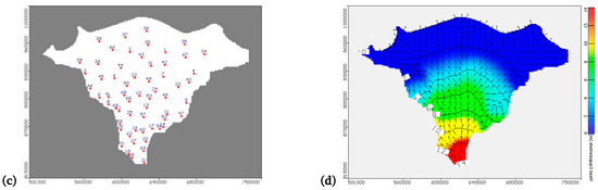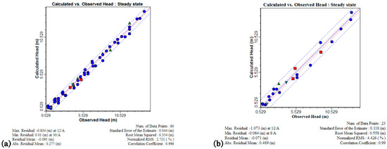 The groundwater flow model was calibrated using 60 field observation wells during the year 2008 [57]. The model was calibrated for steady-state conditions using the initial hydraulic parameters presented in Table 1 by trial and error until simulated groundwater levels matched those measured in the 60 observation wells. After model calibration, the groundwater flow model was validated with an independent set of data (23 points). The residuals between the simulated and the observed groundwater heads ranged from −0.834 to 0.01 m. The absolute mean residual was 0.277 m, while the root mean squared error (RMSE) was 0.354 m, with a normalization RMSE of 2.72% (Figure 5a). This relative agreement of parameters suggests a good correlation between simulated groundwater levels (Figure 5b). The locations of the observation wells used for model calibration and validation are shown in Figure 5c. The results of the groundwater levels in the NDA ranged from 14 m to 0 m above mean sea level (MSL) (Figure 5d); additionally, the groundwater flowed from the South to the North.