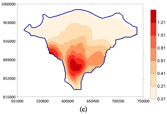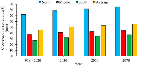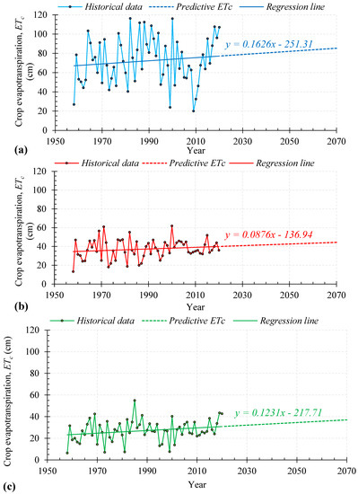 Results of the trend analysis for the annual actual ETc series over 1958–2020 are shown in Figure 6a–c for the three zones in the study area. The mean, median, and mode of the historical data from 1958 to 2020 for the north zone of the ND were 72.13, 69.6, and 67.6, respectively. They recorded 37.28, 36, and 36 for the middle zone, and 27.06, 26.7, and 35 for the southern zone of the ND. The analysis showed increases in annual values of actual ETc in the three zones. Increased actual ETc was due to increasing values of climate parameters. The combination of solar radiation, vapor pressure deficit, and humidity (H) were found to be the best variables for predicting ETc. The increasing percentages were 16.26, 8.76, and 12.31% for the northern zone, middle zone, and southern zone of the ND, respectively.