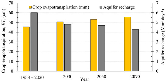 Comparison between the predicted average ETc in 2030, 2050, and 2070, and the corresponding reduction in aquifer recharge (in Mm3 day−1).
