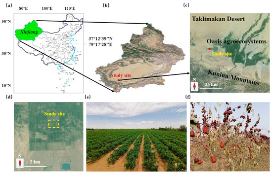 Maps and imagery of the study site. Xinjiang is located in the northwest of China (a) and is characterized by an extremely arid desert climate (b). High levels of agricultural irrigation are required for the oasis agroecosystems in Xinjiang (c). Field experiments were conducted at the Irrigation Test Station of Pimo Reclamation Area (37°12′ N, 79°17′ E) in Kunyu City, Xinjiang (d–f).