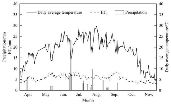 The soil at this site is sandy loam with a pH of 7.88. The depth of groundwater is about 3.0 m, and the maximum depth of frozen soil is 0.67 m. Due to strong evaporation, the problem of soil salinization in this area is serious. The meteorological data during the growth period of jujube is shown in Figure 2. Within the 0–40 cm topsoil, the organic matter, total N, and available P and K are 4.23 g kg−1, 4.82 mg kg−1, 17.61 mg kg−1, and 84.52 mg kg−1, respectively. The physical characteristics of the soil (dry bulk density and field water holding capacity) in different soil layers (0–140 cm) are shown in Table 1.