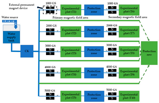 The experimental magnetizer was a permanent agricultural magnet produced by the Inner Mongolia Baotou Magnetic Materials Factory. The permanent magnet was made of sintered Ru iron boron. Magnetizers of different magnetization intensities were fixed to the water supply pipe, vertically to the flow, from pole N to pole S. When the irrigation water flowed through the magnetizer, magnetized water with different magnetic intensities was obtained. A Gauss meter was installed at the end of the pipe to monitor the magnetization of the irrigation water. A schematic diagram of the magnetization system installation in the field plots can be seen in Figure 3.