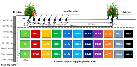 Soil moisture was measured to a depth of 160 cm at 20 cm intervals during different jujube growth periods by drying and weighing the soil. The sampling point was between 0 and 180 cm away from the drip tape. There were seven sampling points in the vertical drip irrigation belt at intervals of 30 cm (Figure 4). The soil was removed by drilling a hole, which was then backfilled with fine soil. Soil samples were collected using a stainless-steel ring knife (100 m3). Three replicate soil samples were taken from each sampling point, corresponding to the horizontal position. These soil samples were oven-dried to a constant weight to calculate the gravimetric soil moisture. The volumetric soil moisture content was calculated based on the measured gravimetric soil moisture and soil bulk density. Soil water storage was calculated to a depth of 0–160 cm.