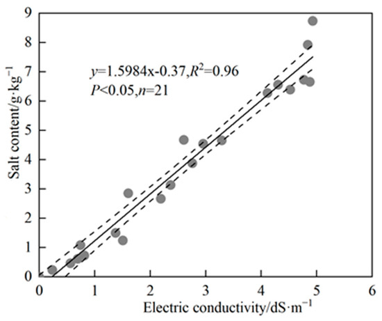 Soil samples before irrigation and at different jujube growth stages were taken to measure soil salinity. The oven-dried soil samples were pulverized and passed through a 1 mm sieve. Then, 20 g of soil powder were taken from each sample and mixed at a ratio of 1:5 with water. After being shaken evenly, the mixture was set aside for 2 h. The electrical conductivities (EC1:5) of the mixtures were measured using a portable electrical conductivity meter (DDS11-A, manufactured by Shanghai Leichi, Shanghai, China). The residue drying mass method was used to calibrate the total amount of water-soluble salts in the soil. The calibration equation for electrical conductivity and salt content was y = 1.5984x − 0.37 (R2 = 0.96; n = 21) (Figure 5). The salt storage (S) per unit area (1 m2) of soil mass at a certain depth was calculated as [21]:
