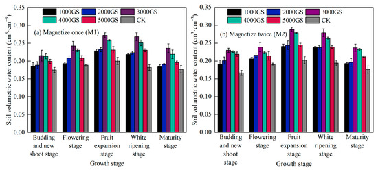 Comparing and analyzing the soil water content following one (M1) or two (M2) magnetization events, the average soil volumetric water contents following irrigation with once magnetized and twice magnetized water were 20.2%, 20.8%, 24.7%, 23.4%, 21.3%, and 21.4%, 21.9%, 25.5%, 24.5%, and 22.6%, respectively. The average volumetric water content of soil following M2 was greater than that following M1 under the same magnetization intensity, while under magnetized water irrigation it was greater than under the non-magnetized treatment. The average soil volumetric water content under each magnetization intensity was in the following order: 3000 Gs ≈ 4000 Gs > 5000 Gs > 2000 Gs > 1000 Gs > 0. When the magnetization intensity was 3000 Gs, the soil volumetric water content was at its maximum, and when the intensity was 0 Gs, the average soil volumetric water content was at its minimum. Compared with the unmagnetized treatment, the average volumetric water content of soil treated with 1000 Gs, 2000 Gs, 3000 Gs, 4000 Gs, and 5000 Gs under M1 and M2 conditions increased by 9.8%, 13.0%, 34.2%, 27.2%, 15.8%, and 16.3%, 19.0%, 38.6%, 33.2%, and 22.8%, respectively.