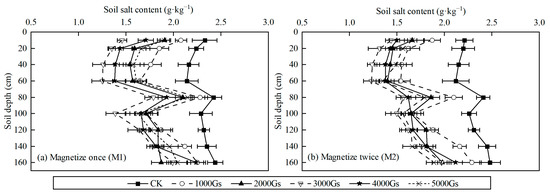 Under the same number of magnetization events, compared with the CK treatment, the soil salt content under magnetized water irrigation decreased significantly, and the average salt content of the soil under different magnetization intensities was in the following order: 3000 Gs < 4000 Gs < 2000 Gs < 5000 Gs < 1000 Gs < CK. Compared with the CK treatment, the average soil salt content under the 1000 Gs, 2000 Gs, 3000 Gs, 4000 Gs, and 5000 Gs treatments following M1 and M2 decreased by 15.0%, 22.8%, 32.8%, 26.3%, 21.3%, and 19.0%, 26.8%, 33.7%, 29.3%, and 29.0%, respectively. Following magnetization at 1000 Gs, 2000 Gs, 3000 Gs, 4000 Gs, and 5000 Gs, the average soil salt content under M2 decreased by 5.2%, 5.6%, 1.8%, 4.5%, and 3.3% compared with M1, respectively. When the magnetic intensity was 3000 Gs, the salt content of the 0–80 cm soil in the root layer of jujube was relatively low, and the desalting effect of two magnetization events was better than that of one magnetization event.