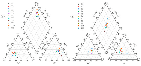 Piper plots of soil salt ions under different magnetized water irrigation treatments. The Piper diagram shows the composition and evolution characteristics of the main ions in the soil solution irrigated with different magnetized water treatments [23,24,25]. (a) the initial percentage ratio of soil salt ion groups under different treatments before magnetized water irrigation; (b) the percentage ratio of soil salt ion groups at the end of the growth period of jujube under different magnetized water irrigation treatments.
