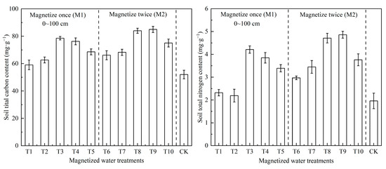 The total C content of 0~100 cm soil irrigated with magnetized water was 59.02–84.96 mg·g−1, and the total N content of the soil was 2.19–4.86 mg·g−1. The total C and N contents of soil irrigated with unmagnetized water were 52.01 mg·g−1 and 1.96 mg·g−1, respectively (Figure 9). Compared with the unmagnetized water irrigation treatment, the total C content when magnetized water was used for irrigation increased by 13.48%–63.35%, and the total N content increased by 11.73%–147.96%. Under magnetization intensities of 1000 Gs, 2000 Gs, 3000 Gs, 4000 Gs, and 5000 Gs, the total C content of soil under the M2 treatment increased by 12.03%, 8.92%, 6.9%, 11.42%, and 9.39%, and the total N content increased by 28.02%, 57.53%, 11.88%, 26.23%, and 10.91%, respectively, compared with the M1 treatment. Magnetization intensity increased the soil C and N contents, which increased further with the magnetization intensity. Under M1 and M2, when the magnetization intensity was 3000 Gs and 4000 Gs, the soil total C and N content was relatively high, and there was no significant difference between the 3000 Gs and 4000 Gs treatments.