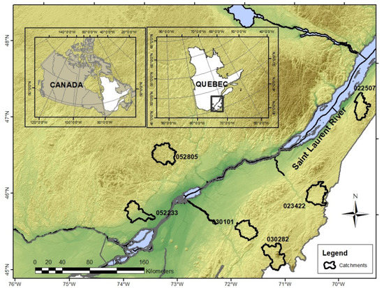 The authors acknowledge the Quebec government (Ministère de l’Environnement et de la Lutte contre les changements climatiques, MELCC) for the interpolated meteorological data (precipitation and temperature), hydrometric data, digital representation of the river network, and integrated description of land uses.