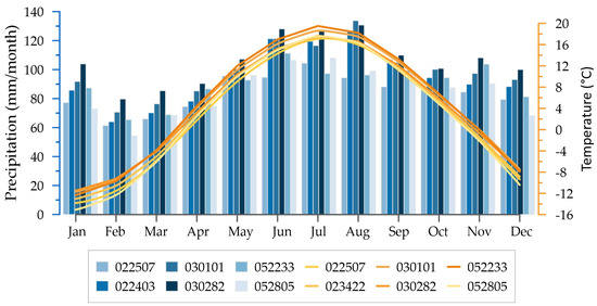 Six natural regime catchments tributaries of the large St. Lawrence River basin, located in Quebec, Canada (Figure 1), were chosen for this study. Their main characteristics are given in Table 1. The catchment areas vary from 512 to 761 km2. Five basins have gentle slopes (4–9% gradient), and only the 052805 catchment has a moderate slope (13.4%). The total precipitation (P) ranges from 1000 to 1260 mm/year, a substantial part of which accumulates as seasonal snowpack (October–April) and the rest as rainfall (mostly May–September). The highest monthly precipitation occurs in July. The second highest precipitation is in October, slightly less than in July. The lowest monthly precipitation is in February, but overall, precipitation is quite uniform (changes are small and gradual from one month to the next). The mean annual temperature (T) ranges from 3 °C to 5 °C, with the maximum monthly mean in July and the minimum monthly mean in January (Figure 2). Snowfall is very similar in all catchments, ranging from 190 to 225 mm/year (snow water equivalent or SWE). The evapotranspiration (ET) varies from 435 to 570 mm/year. ET and SWE are estimated by the model.
