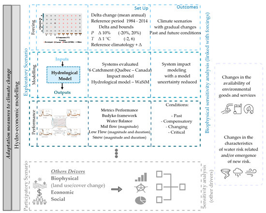 Modeling set up. The design of adaptation measures includes hydro–economic modeling composed of exploratory and participatory scenarios. In the former (in blue), three consecutive processes are shown in the rows: forcings, modeling, and performance, and in the middle and right–hand columns, respectively, the configuration and results obtained in this study. These three steps together constitute a sensitivity analysis of one of the biophysical components of the systems. In the lower part (in gray), the second scenarios are listed, which involve other biophysical components as well as the socioeconomic components that analyze the system’s vulnerability to other drivers. Finally, the central issues addressed by climate change adaptation are summarized on the right side (in purple).