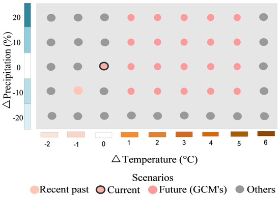 Figure 4 shows the exposure space, which, as its name indicates, is the space comprising each of the scenarios to which the systems are exposed (described in the methodology section and summarized in Figure 3), representing the climatic conditions in terms of changes in temperature and precipitation of the recent past in the year 1948 [68,97] and a variety of future scenarios comprising the scenarios projected by the climate models [68] of the evaluated horizon.