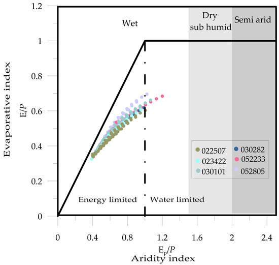 Budyko framework. The Y–axis represents the evaporative index, and the X–axis the aridity index. The response of each basin is represented by the colors shown in the box at the bottom right. From left to right, the climatic zones are shown: humid, dry sub–humid, and semi–arid in white, light gray, and dark gray, respectively. The vertical dotted line marks the division for energy–limited and water–limited zones.