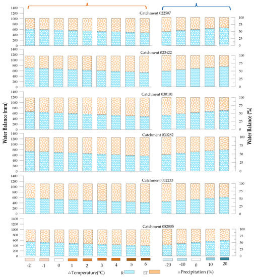 Water balance. Each bar represents the total multiannual precipitation for each watershed. The orange fraction of each bar represents evapotranspiration (ET) and the blue fraction represents runoff. The figure is divided into two parts, the first corresponding to constant precipitation (current conditions) and changes in temperature (presented in the left part of the figure, those included in the orange key) and the second corresponding to a constant temperature (current conditions) and changes in precipitation (presented in the right part of the figure, those included in the blue key). On the left, the figure shows the water balance in mm to represent the total precipitation values of each basin; on the right, the water balance is presented in percentages so that they are graphically comparable with the results of the balances associated with the change in temperature.