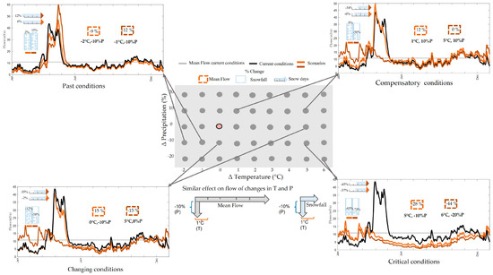 Mid–flow conditions and snow. In the center of the figure is the exposure space (explained in Figure 4), where arrows indicate which pairs of scenarios are referred to in each of the hydrographs. Below, represented by thick arrows, are the equivalent changes or compensatory scenarios in the vertical sense precipitation and in the horizontal sense temperature of the mean annual flows (gray) and snowfall (blue). Each graph shows the interannual hydrograph of recent conditions (black line) and of two evaluated scenarios (shown in orange colors, the darker one being the one with higher temperature and lower precipitation). The gray line represents the average flows of the current conditions. The values within the graph correspond to the percent change of each scenario concerning the current conditions. Within the dashed line boxes are the values of the changes in mean flows for each scenario. The percentage change of snowfall is represented by the light blue bars, where the white part represents the loss of snow and the part with snowflakes is the amount that remains. The percentage change of snow days is represented by the pencils, where the color of the tips represents the scenario to which it belongs, the light blue part represents the percentage of days with snow, and the white part is the decrease in days with snow.