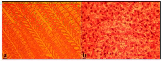 (a,b) Tissue sample of Capoeta (Capoeta capoeta) in the control group (0 mgL−1 of Ag-NPs); (a) gills of fish (magnified ×40); (b) liver of fish (magnified ×40).