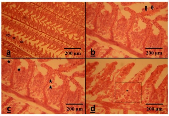 - Vajargah, M.F.; Namin, J.I.; Mohsenpour, R.; Yalsuyi, A.M.; Prokić, M.D.; Faggio, C. Histological effects of sublethal concentrations of insecticide Lindane on intestinal tissue of grass carp (Ctenopharyngodon idella). Vet. Res. Commun. 2021, 45, 373–380. [Google Scholar] [CrossRef] [PubMed]