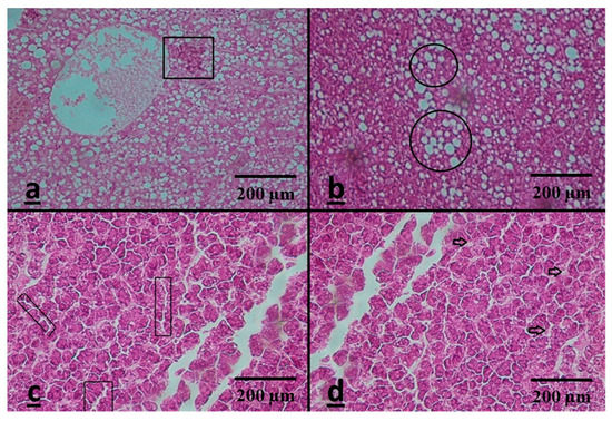 (a–d) Liver lesions of Capoeta (Capoeta capoeta) 96 h after exposure to different levels of Ag-NPs; (a) macrophage aggregates (Ag-NPs were 5 mgL−1—magnified ×40); (b) fatty liver (Ag-NPs were 10 mgL−1—magnified ×40); (c) dilation of sinusoid (Ag-NPs were 15 mgL−1—magnified ×40); (d) necrosis (Ag-NPs were 15 mgL−1—magnified ×40).