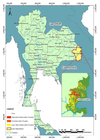 Ubon Ratchathani is a province in northeast Thailand located in the Mun Basin. The Mun River is one of the three main tributary rivers of the Mekong. Its watershed area covers more than 69,700 square kilometers. The Land Development Department, Ministry of Agriculture and Cooperatives, Royal Thai Government, has reported that the Mun River Basin contains large and small reservoirs with a water retention capacity of around 3979 million cubic meters, which is not enough to meet the water use demand in the area []. The water required in this area equates to around 3061 million cubic meters, which is lower than the full capacity of all the reservoirs established in the area; nevertheless, the Department of National Parks, Ministry of Natural Resources and Environment, Royal Thai Government [], has reported that in this area, the lack of water supply is still the main problem for agriculture, and the extra water needed in this area equates to more than 1188 million cubic meters annually. This is because the lower water level of the Mekong causes the Mun River to flow down faster to the Mekong, making drought occur in the area.