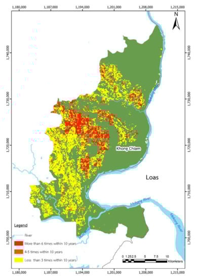 The lower water level in the Mekong enhances water flow from the Mekong’s tributary rivers. The result of this is that the large reservoirs along the rivers must provide water to the rivers in order to maintain water usage, especially throughout the agricultural production process, which is the primary occupation of people living in Ubon Ratchathani and other provinces in northeastern Thailand. The large reservoirs constructed in the northeast of Thailand comprise around 11,462 million cubic meters, while the water use requirement in the area is around 10,815 million cubic meters. Thus, the northeastern part of Thailand has not been considered to be likely to experience water supply problems. However, according to the statistics of the drought reported, in the northeastern part of Thailand, especially Ubon Ratchathani, more water is needed for agricultural production—around 2496 million cubic meters. It has been proven that the amount of water available during the year is theoretically sufficient; however, due to the lower level of the Mekong, water from its tributary rivers tends to flow down into the Mekong and finally down to the South China Sea through Vietnam as a result of the drought in this area [].
