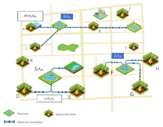 This section introduces the CR–WSND mathematical model for agricultural applications. To analyze the benefit of establishing CRs in a high-risk region, the objective function was used to reduce the building costs associated with the community reservoirs and network. Figure 3 is a graphical representation of the cost terms in the objective function.