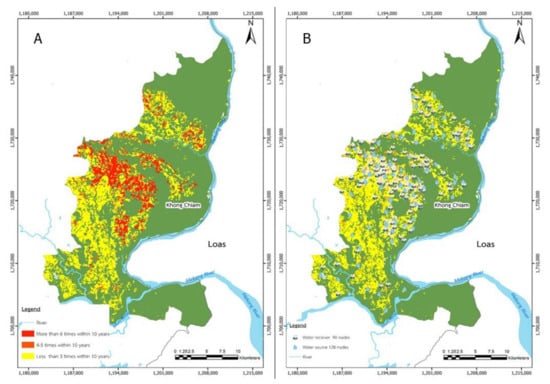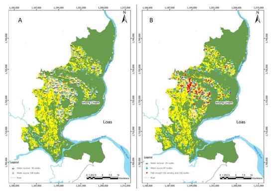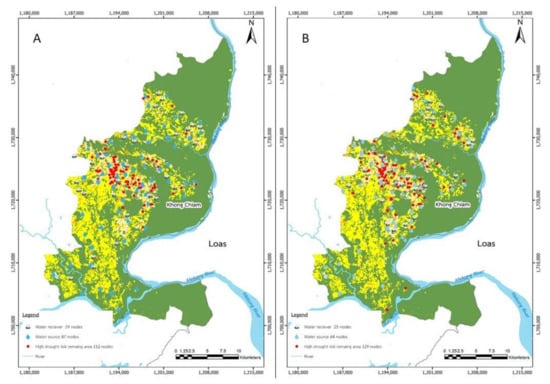 Figure 2 shows a drought risk plot of Khong Chiam City. Khong Chiam is located in the Mun Basin and is the last city in Thailand before the water from the Mun River flows down to the Mekong. Khong Chiam has a vast drought risk area, around 1,217,600 m2 [], which must be managed before it has a significant effect on the agricultural production supply chain. Drought has been particularly harmful to the rice yield in the Mun River Basin, which has the lowest rice yield in Asia []. Future arid conditions in this region are expected to have a greater impact on the agricultural production supply chain []. Along the Mun River and between the provinces of Nakhon Ratchasima and Ubon Ratchathani, seven large dams have been constructed. Even though they can gather more than 3900 million cubic meters of water, the number of regions with a high danger of drought is expanding. This suggests that the water supply in this region must be revised in order to preserve the agricultural supply chain from damage caused by drought. In many regions of the world where hydrological variability is considerable, Hughes, D. and Mantel, S. [] have demonstrated that even a small reservoir can boost water supply reliability. Thus, we expect that increasing the number of small reservoirs will have a positive effect on the downstream flow volumes and patterns of water in the examined area.