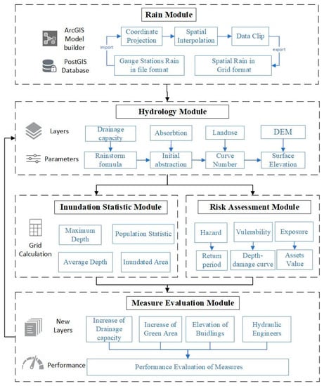 The SUIM encapsulates the sub-modules of the rainfall module, hydrology module, spatial statistics module, risk assessment module, and measure evaluation module to provide technical solution for integrated risk assessment and measure evaluation. The coupled sub-modules can optimize the simulation process and computing efficiency. The model adopts a PostgreSQL database that supports GIS spatial data storage. It supports GIS spatial analysis and calculation, including clipping of features, extraction of layers, coordinate transformation, and spatial interpolation. The model’s underlying data employ a regular grid structure, which has the advantages of speedy calculation, simple logic operation, and automatic processing capability. The integrated model is suitable for various applications, including backtracking of historical events, early warning of inundation forecasting, future scenario evaluation, and pre-planning of hydraulic engineering [30]. The overall architecture process is shown in Figure 1.