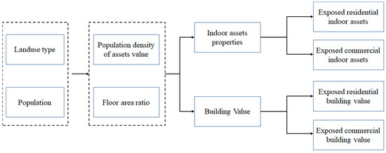 Assets of building values and their indoor properties are evaluated as the exposed value of assets in this work. In highly populated areas, buildings at risk had a fraction of their market value since only a proportion of economic assets are exposed to floods, especially in the high-rise building area. The exposed value of assets therefore should not be the total value of the building. In evaluating the maximum possible loss to the structures, the floor area ratio (FAR) was utilized to evaluate the market worth of the buildings, circumventing the absence of data on the number of stories at each level of urban buildings [40]. The FAR can determine the flood area of the structures; therefore, the buildings’ market worth may be evaluated by multiplying the flood area (m2) by the construction cost ($USD/m2). Assumption based on population density and development intensity is addressed using population data [41]. The distribution of FAR and population density in the central urban area reflect the spatial distribution of asset value [19]. The detailed process is seen in Figure 2. SUIM conducts overlapping analysis on waterlogging scenarios with multiple return periods and the value distribution of elements at risk to calculate exposed assets.