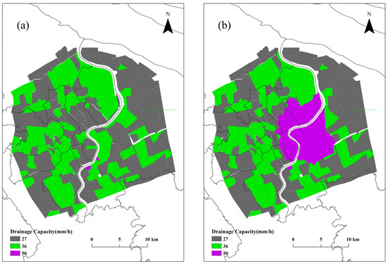 The drainage capacity of the central urban area of the study area (a) and the capacity of the drainage pipe network enhanced from 27 mm/h to 36 mm/h (b).