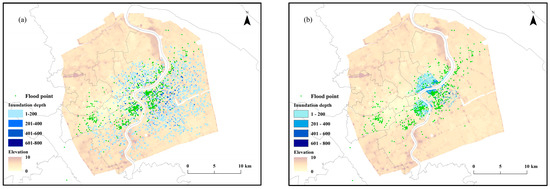 SUIM simulation results show that affected by topographic, and drainage capacity, the flooded area caused by rainfall waterlogging during the “9.13” rainstorm mainly occurs in the low-lying areas of central Shanghai. The most inundated depth is above 150 mm, the highest depth of which is over 841 mm. The areas with the maximum inundation depth are near Pudong Century Avenue and Century Park, which is basically consistent with the actual disaster records. As this study filters waterlogging with an inundation depth of less than 150 mm, compared to the “110” alarm data, it demonstrates that even the inundation area of the SUIM model is smaller than the area of alarm data, the spatial distribution of the inundation area is in good agreement with the alarm data (Figure 5a).