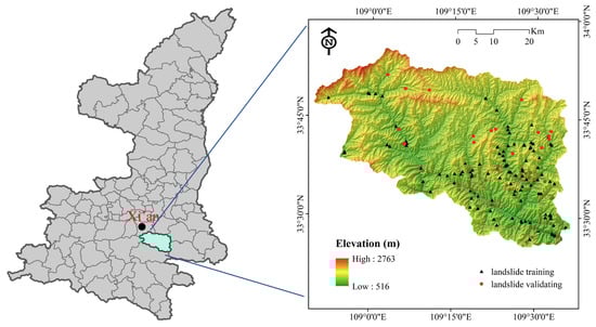 Zhashui County, selected as the study area, is located in the western region of Shangluo (Shaanxi Province, China) and covering an area of nearly 2322 km2. The area is between the longitudes 108°50′ E and 109°36′ E, and the latitudes 33°25′ N and 33°56′ N (Figure 1). The lowest elevation in the study area is 516 m above sea level (a.s.l) and the highest elevation is 2763 m a.s.l. The slope angle varies from 0° to 74°. The averages of elevation and slope are 1306.96 m and 27.28°, respectively. The climate is a transition zone between subtropical and warm climates, with the characteristics of a monsoon climate due to the barrier function of the Qinling Mountains and their mountain topography. Precipitation is seasonal, with 80.5% of the annual rainfall falling in summer and early autumn, concentrated in July, August, and September. The average annual rainfall is 750 mm. Landslides frequently occur in the southeastern part of Zhashui County as illustrated in Figure 1.