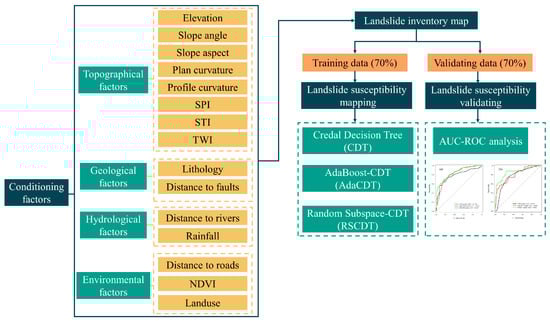 In this study, an analysis of landslide susceptibility was carried out using three approaches. The methodological steps are illustrated in detail in Figure 2, including: (1) the preparation of a landslide inventory map; (2) selecting the appropriate landslide conditioning factors; (3) modeling landslide susceptibility using CDT and its two ensembles—AdaCDT and RSCDT; (4) evaluating the success rate and prediction accuracy of the three models; and (5) making the landslide susceptibility map.