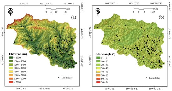 Elevation is highly related to landslide occurrence; therefore, it is a vital conditioning factor when carrying out regional landslide susceptibility mapping []. In mountainous areas, the regional microclimate and human activities will be mainly affected by elevation, which will in turn trigger landslides, meaning landslides will be characterized by vertical zoning. In Figure 3a, elevation values were grouped into eight classes with an interval of 200 m.