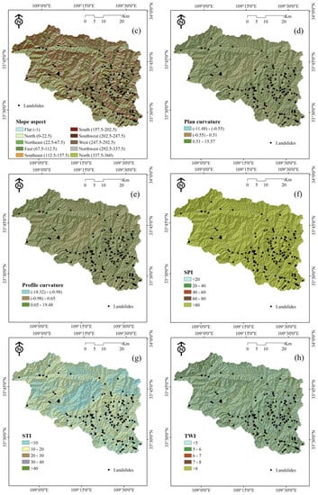 Slope aspect has an impact on the hours of sunshine, the intensity of solar radiation, and rainfall, which will affect vegetation coverage and soil moisture []. Hence, slope aspect has also been used as a common conditioning factor for a landslide susceptibility inventory. Ultimately, slope aspect within the study area was reclassified as: flat (−1), north (0–22.5°), northeast (22.5°–67.5°), east (67.5°–112.5°), southeast (112.5°–157.5°), south (157.5°–202.5°), southwest (202.5°–247.5°), west (247.5°–292.5°), northeast (292.5°–337.5°), and north (337.5°–360°) (seeing in Figure 3c).