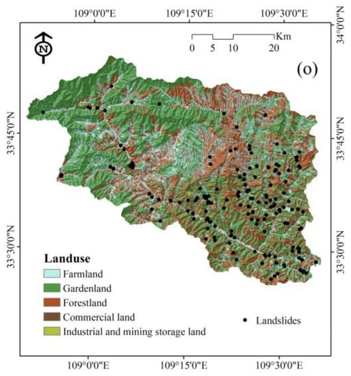 Land cover is an indirect conditioning factor for slope stability. Usually, barren and sparsely vegetated regions tend to be more susceptible to erosion and will bear greater instabilities compared with a thick forest []. Generally, agriculture is conducted on gentle and low slopes. However, some farming activities take place on moderately steep slopes, which will lead to rising water levels due to long-term irrigation. Therefore, landslides are more likely to occur on agricultural slopes. The study area was classified into five groups (Figure 3o), including farmland, garden land, forestland, commercial land, and industrial and mining storage land.