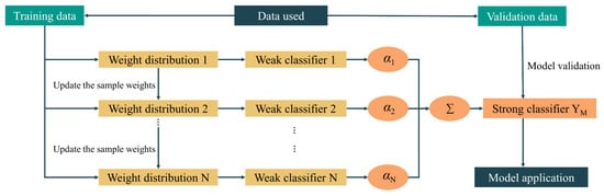 A weak classifier is defined as ym and the corresponding classification error rate is εm. αm represents the weight of the weak classifier ym. YM is the final strong classifier integrated from all the weak classifiers. The detailed mathematical steps are presented as follows [].