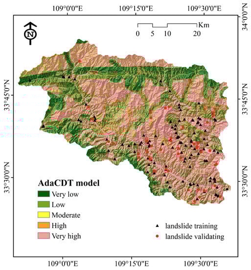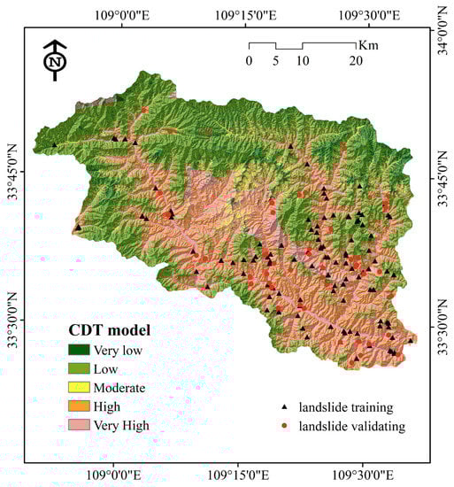 Assessing landslide susceptibility of a certain area is a complex task and remains challenging. The key to the assessment relies on the applied models and selected conditioning factors. In various publications, many researchers have tried to improve the performance of models for landslide susceptibility prediction, while the quality and prediction accuracy of these models are determined by the used methods. New machine-learning techniques have been proven to be capable and efficient in boosting prediction performance []. Therefore, the authors tried to combine the CDT model with two machine-learning ensemble frameworks (AdaBoost and random subspace) to create an LSM. According to current publications, this kind of investigation has not been performed in Zhashui County; hence, it was selected as a case study.