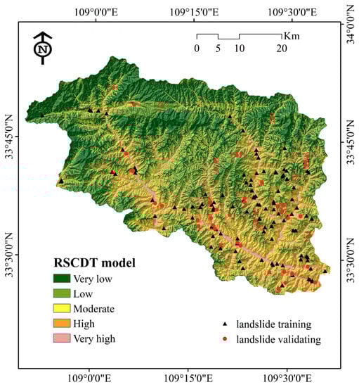For the CDT model (Figure 7), the LSI ranges from 0.000 to 1.000, and the reclassified five groups are as follows: very low (0.000–0.031), low (0.031–0.165), moderate (0.165–0.325), high (0.325–0.706), and very high (0.706–1.000). The corresponding area percentage is 44.92%, 4.26%, 15.70%, 20.08%, and 15.05%, respectively. Regarding the two ensemble models, LSIs of the AdaCDT (Figure 8) and RSCDT (Figure 9) vary from 0.000 to 1.000, and 0.097 to 0.900, respectively. The LSM generated by the AdaCDT model is covered by an area percentage of 15.84% with very low (0.000–0.090), 15.94% with low (0.090–0.267), 7.80% with moderate (0.267–0.502), 11.10% with high (0.502–0.780), and 49.33% with very high susceptibility (0.780–1.000). Additionally, regarding the RSCDT model, the five regrouped classes are very low (0.097–0.289), low (0.289–0.428), moderate (0.428–0.579), high (0.579–0.742), and very high susceptibility (0.742–0.900), accounting for 35.45%, 24.43%, 19.65%, 14.88%, and 5.59%, respectively.