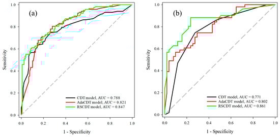 Landslide susceptibility frameworks were constructed with the training dataset using the CDT model and its two ensembles, namely the AdaCDT model and RSCDT model. Although there are still some discussions about the accuracy of proposed modeling approaches in various publications, it is indeed necessary to carry out some research on assessing the performance of new models on landslide susceptibility mapping in terms of spatial analysis and prediction ability. In the present study, landslide susceptibility indices (LSI) based on the three models for Zhashui County were computed to produce the rasterized LSM in the ArcGIS 10.5 software. Finally, all the LSMs were regrouped into five classes, including very low, low, moderate, high, and very high, based on the natural breaks method [,]. The area percentage of each group for every model is illustrated in Table 4.