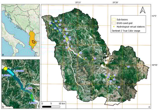 The Banja watershed, its location (a), and overview of the Banja reservoir (b). (c) The ERA5-Land grid is superimposed with orange lines, while numbered points indicate the virtual stations where the hydrological parameters are derived. (b) The cyan polygon is the central virtual station chosen as representative for the reservoir, while yellow and green polygons are used for spatial analysis and correspond to dam and inflow locations respectively. The names of the main inflows are numbered and shown in (b).