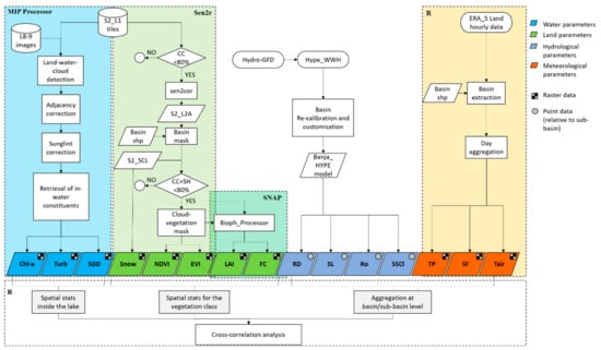 As shown in Figure 2, the retrieval of the parameters describing each environmental compartment is complex and involves the use of different software and processors purposely built for the elaboration of satellite images (e.g., Sen2r or SNAP), as well as commonly used tools for statistical analysis (e.g., R). In the following paragraphs, each processing step is described in detail following this structure: retrieval of satellite derived parameters (Section 2.2.1), modelling of hydrological parameters (Section 2.2.2), synthesis of meteorological variables (Section 2.2.3), and statistical analysis (Section 2.2.4).