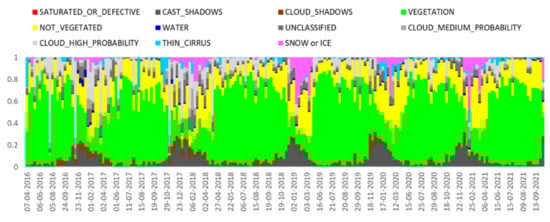 Plot of the relative percentages of scene classification map classes inside the Banja basin for each S2 acquisition tile with less than 80% of cloud coverage.