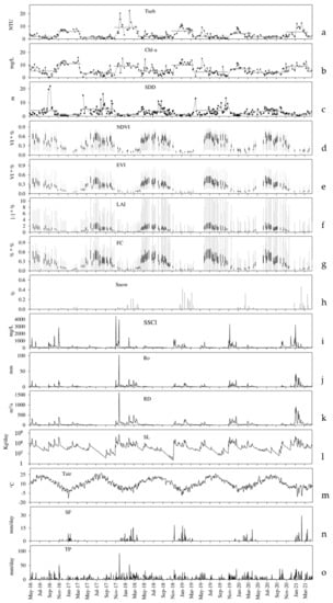Figure 4 shows the temporal series of each water quality, land, meteorological, and hydrological parameter. The common temporal range considered stretches from 7 May 2016 (first date of S2 overpass over the completely filled Banja reservoir) to 24 April 2021 (when hydrological simulations stop). The first three plots (Figure 4a–c) show the EO derived water quality parameters Turb, Chl-a, and SDD as retrieved by the MIP processor (see Section 2.2.1 and Figure 2) for a central polygon of the Banja reservoir (Figure 1). The water quality timeseries consists of 375 values within the time range considered, since S2 acquisitions were increased with good quality Landsat 8–9 acquisitions (Figure 2, Table 1). In this way, it is possible to have a denser dataset, which is good for appreciating temporal variations of the observed parameters. All three parameters show a seasonal behavior, with higher values during autumn–winter and lower values during spring–summer for Turb and Chl-a, while SDD shows an inverted trend, since it is notoriously influenced and reduced by the presence of dissolved and suspended substances inside the water column. Maximum averages along the autumn–winter season range around values of 6.25 NTU and 9.14 mg/L for Turb and Chl-a respectively, while minimum averages range around 1.82 NTU and 4.49 mg/L during the spring–summer season. At the same time SDD moves around minimum values of 1.42 m during autumn–winter, to its average maximum values around 4.11 m during spring–summer. These trends suggest that the temporal variability of water quality inside the Banja reservoir is strongly influenced by a seasonal phenomenon. Besides the seasonal trend, some relative peaks are visible along the years. In particular, a strong increase in Turb is registered during December 2017 and February 2018, with NTU values above 20. Other minor increases (around 10 NTU) of Turb are recurrently observed during January of each considered year. Instead, relative peaks of Chl-a occur mostly during March (2017, 2019, and 2021), May (2018 and 2019) or even December (2017, 2019, and 2020) or January (2019, 2020, and 2021). SDD shows high peaks generally during spring–summer, e.g., April and August 2017, 2018, and 2019. The maximum value of SDD is registered in September 2016, some months after the operativity of the Banja dam.