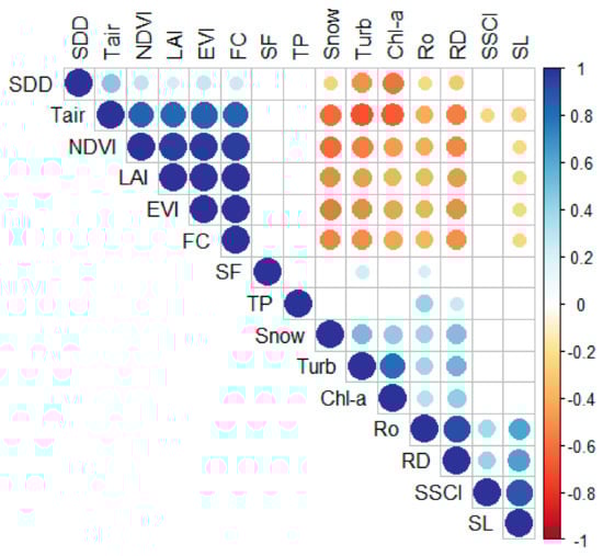 Positive correlations are represented with bluish colors, while negative correlations with reddish colors. Points are proportional to the correlation coefficient and not statistically significant correlations, for which p > 0.01, are blank. Parameters belonging to the same water group, such as water quality or vegetation group (e.g., Turb, and Chl-a or NDVI, EVI, LAI and FC), are positively correlated (> 0.5 corr coeff for water quality parameters, >0.9 corr coeff for vegetation parameters). Hydrological variables are generally negatively correlated with vegetation descriptors (with a greater correlation for RD (<−0.49) and Ro (<−0.37)), which in turn are negatively correlated with water quality parameters (from −0.48 to −0.55 for Turb and from −0.39 to −0.46 for Chl-a). This leads to a positive correlation between hydrological variables and water quality parameters (0.4 corr coeff between Turb and Ro and 0.55 between Turb and RD). Snow and SF are negatively correlated with vegetation descriptors (from −0.53 to −0.61 for snow and from −0.15 to −0.17 for SF, but with no significant correlation) and positively correlated with water quality parameters (0.51 and 0.24 respectively with Turb, and 0.44 corr coeff between snow and Chl-a) and hydrological variables (0.41 with Ro and 0.49 with RD for snow, and 0.22 with Ro). SDD is slightly positively correlated with vegetation descriptors (corr coeff from 0.22 to 0.29) and slightly negatively correlated with hydrological variables (−0.24 corr coeff with Ro and −0.3 corr coeff eith RD). Tair is positively correlated with SDD (0.46 corr coeff) and with vegetation descriptors (>0.8), while it is negatively correlated with Turb (−0.69) and Chl-a (−0.66). TP has a positive significant correlation only with Ro (0.42) and RD (0.27). SSCl is significantly correlated only with Tair (−0.24) and with Ro and RD (0.38 and 0.41, respectively). SL has slight but significant negative correlations with vegetation descriptors (from −0.23 to −0.25) and Tair (−0.28), and strong positive correlations with Ro, RD, and SSCl (>0.6).