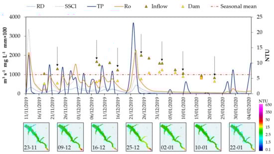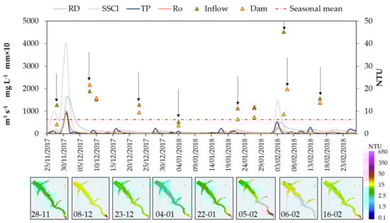 Timeseries of RD, SSCl, TP, and Ro, with mean Turb values at inflow (green triangles) and dam (yellow triangles) virtual stations. Black arrows indicate the dates for which the relative Turb map is shown. The red dotted line represents the Turb autumn–winter seasonal mean averaged over the 5-year period. Note that TP and Ro are expressed in mm×10 to have a better representation.