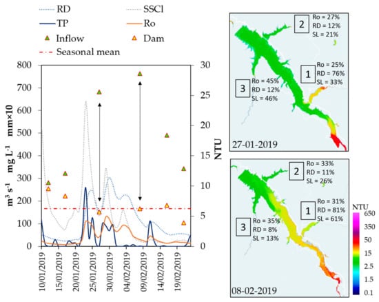 The spatial variability of the water quality within the Banja reservoir changes relatively fast and depends on tributary contributions. Figure 8 shows a case in which, although the difference in Turb between the two virtual stations (Inflow and Dam) is very similar, Turb maps show different spatial patterns. These spatial patterns can be explained considering how Ro, RD, and SL are spatially distributed in the sub-basins around the reservoir. If we express Ro, RD, and SL through their relative percentage for each inflow, excluding the main one (Devoll river), which always contributes the most to the supply of sediments in the reservoir (more than 70%), we can see that there is a gradual increase of Ro, RD, and SL in the contribution of sub-basin one (Holta inflow). In particular, the SL contribution on 8 February is double the one on 27 January. Here, two rivers join in the Holta river and enter the reservoir. The doubled RD favors the transport of sediments within the river waters, spreading along the majority of the reservoirs. Shushica and Skebica rivers, instead, have a small contribution to the supply of sediments inside the reservoir.