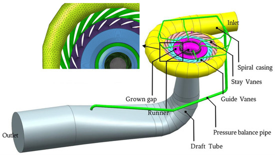 - Liu, S.; Sun, Y.; Zuo, Z.; Liu, J.; Wu, Y. Numerical simulation and analysis of the pressure pulsation transfer characteristics of a prototype water pump turbine. In Proceedings of the Nineteenth China Hydropower Equipment Symposium, Dalian, China, 21–24 November 2013; pp. 58–65. [Google Scholar]