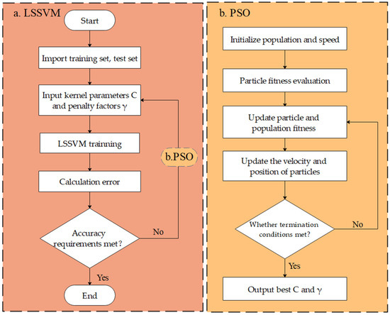 Figure 1 shows the overall process of the PSO-LSSVM algorithm. The kernel parameter C and penalty factor in the LSSVM play decisive roles in the accuracy of the model. Therefore, the PSO is utilized to optimize the C and the , and the process of the PSO algorithm is presented in Figure 1b. The specific steps are summarized: